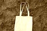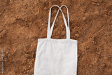 White cotton or mesh bag on beach sand background. Zero waste, no plastic, eco friendly shopping, recycling concept. Blank mockup shopper with place for artwork or text. Flat lay, copy space