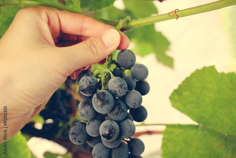 A female hand picks up a blue bunch of grapes. The harvesting. Toned image.
