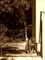 Striped gray cat yawning in the garden of a Menorcan house, with trees in the background and a stone floor, under the sun.