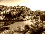 Aerial view of Cala Turqueta in Menorca: crystal-clear turquoise sea, white sand, and green pines under a clear sky. Natural and idyllic Mediterranean landscape.