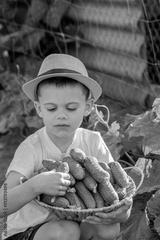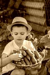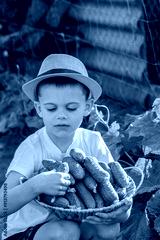 a boy farmer holds a basket with freshly picked cucumbers. Selective focus
