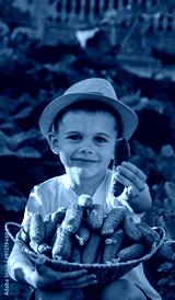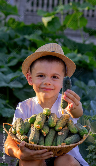 a boy farmer holds a basket with freshly picked cucumbers. Selective focus