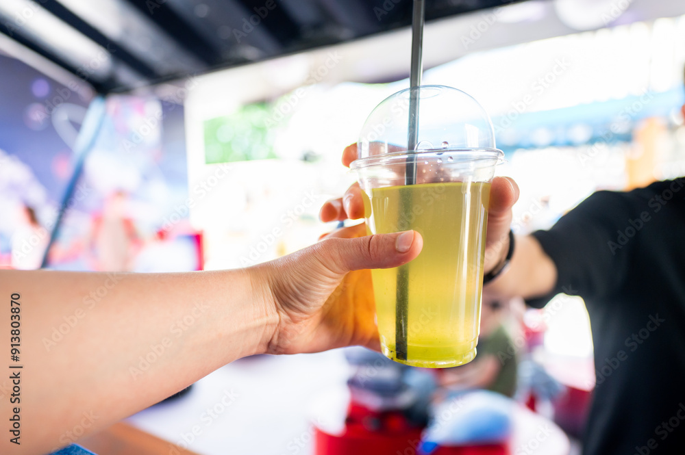 A hand holding a plastic cup with a yellow drink and a straw, extended towards another person in an outdoor setting. The background features greenery and a blurred landscape