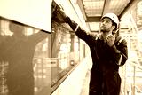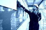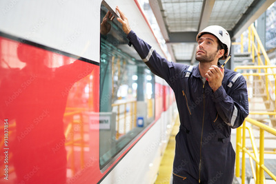 Technician or worker talking about work on walkie talkie and checking at construction train station