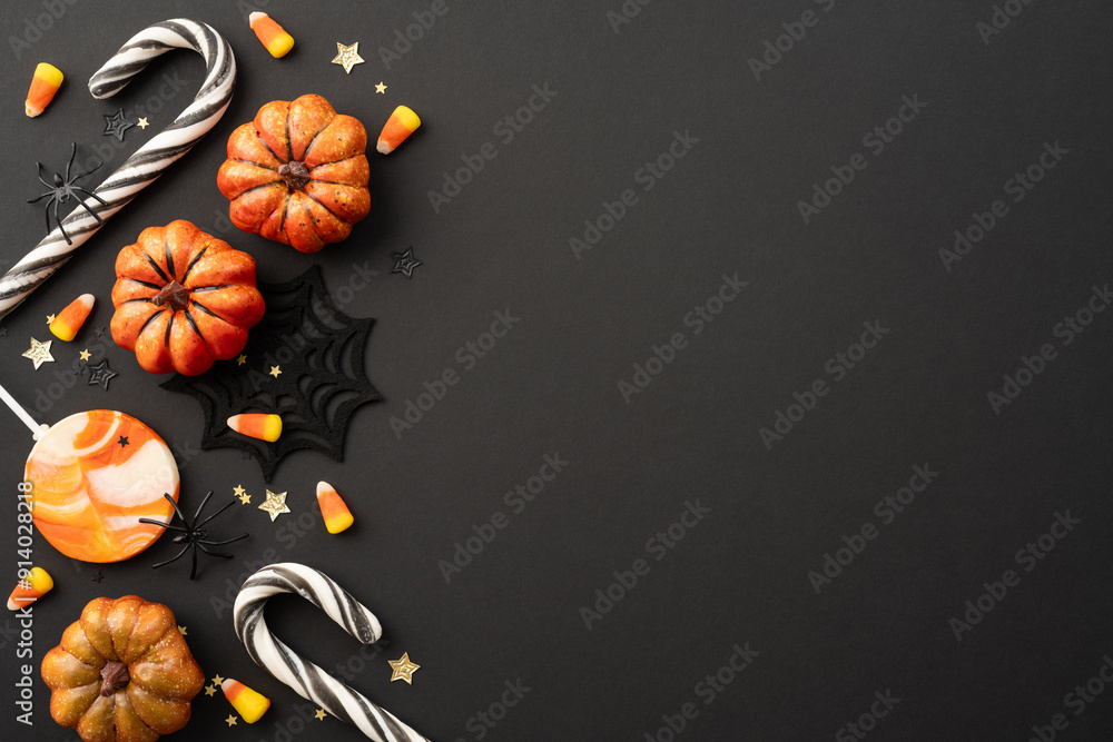 Halloween themed background featuring candy, pumpkins, and spooky decor elements on a black backdrop