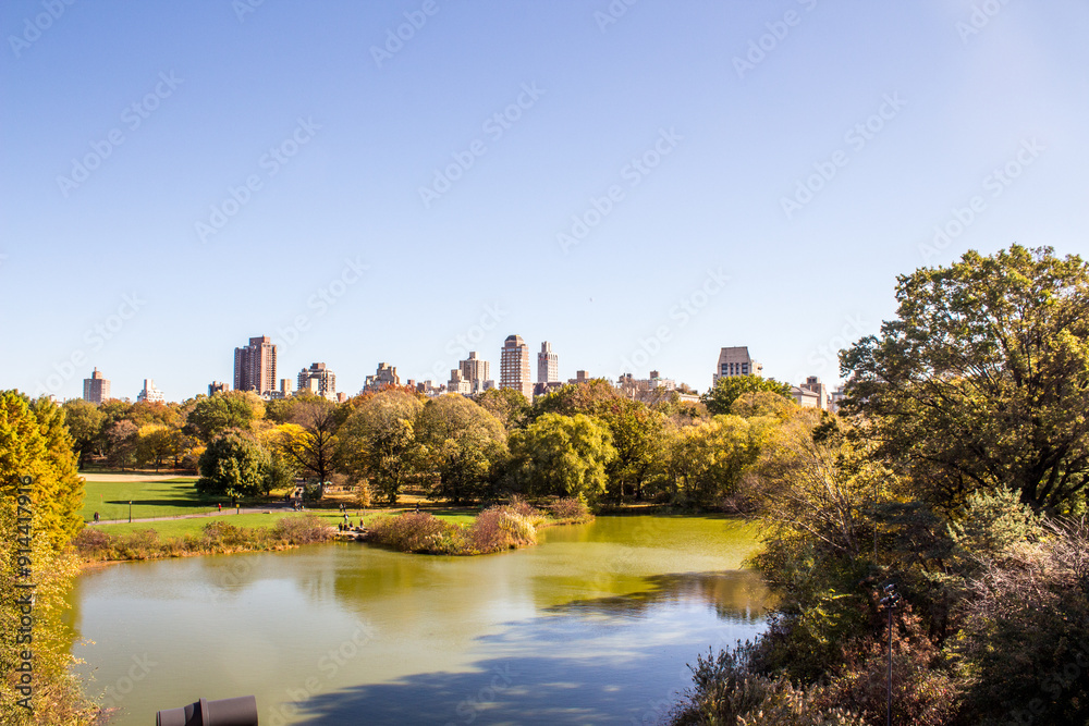 Sunny day view of a Central Park lake surrounded by trees, with a backdrop of skyscrapers in the distance