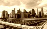 Black and white close-up of the industrial steel beams of the Brooklyn Bridge, with Manhattan's skyscrapers and the Hudson River in the background. A high-contrast urban and industrial scene