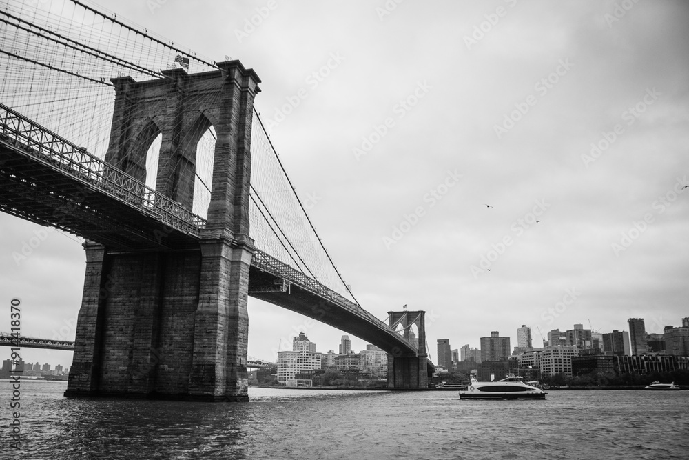 Black and white photograph of the Brooklyn Bridge, the Hudson River, and the Brooklyn neighborhood in the background on a cloudy day, with a small yacht in view.