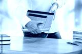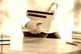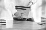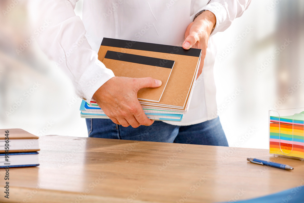 Woman in white blouse at wooden desk with notebooks and stationery. Female teacher hands taking students' notebooks.