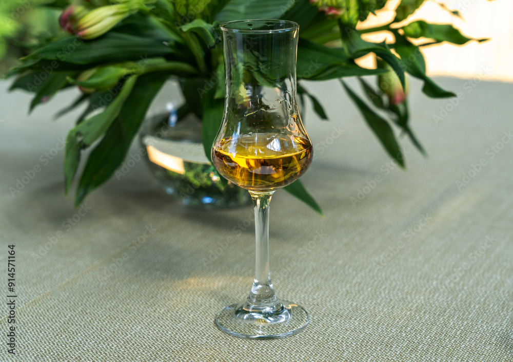 Amaretto almond liquor, sweet alcohol drink, brown Italian liquor made from apricot kernels, on summer table