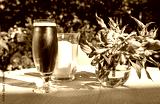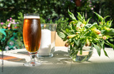 Cold dark beer on restaurant table, craft porter beer, ale froth pint glass in garden on a sunny summer day