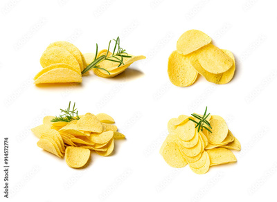 Potato dill chips pile isolated. Crispy thin potato snack heap set, fast food snacks with greens, spices