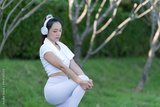 Beautiful and happy Asian woman holding a water bottle to drink after morning exercise in the park stretching and warming up before morning jogging