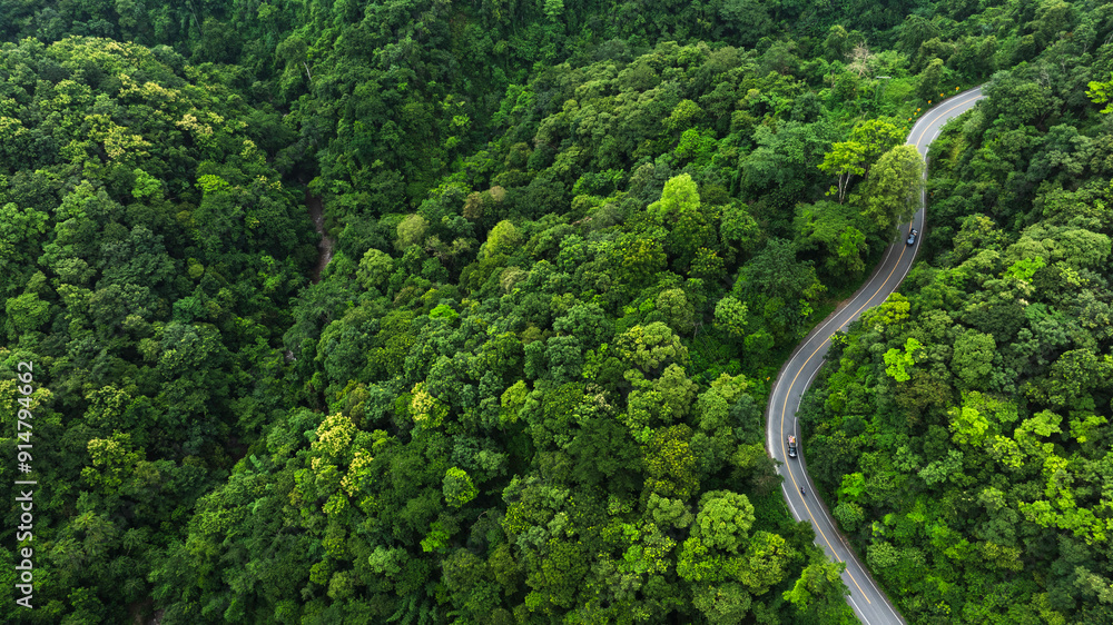 Aerial view of a road in the middle of the forest , Ecosystem ecology healthy environment road trip travel.