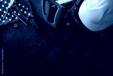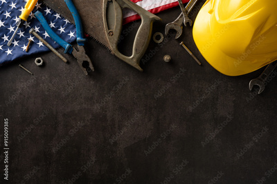 Labor Day concept featuring construction tools and yellow hard hat on dark background with American flag