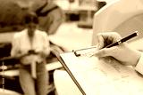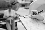 A young Caucasian man and an Asian woman inspect a damaged car after an auto accident. The insurance agent examines the vehicle, writing a report while gathering evidence for the claim investigation a