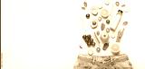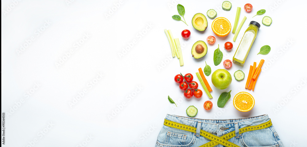 Fresh fruit, vegetables, smoothie falling into jeans and yellow measuring tape instead of belt on white background. Concept of weight loss, detox, diet, healthy clean nutrition, copy space