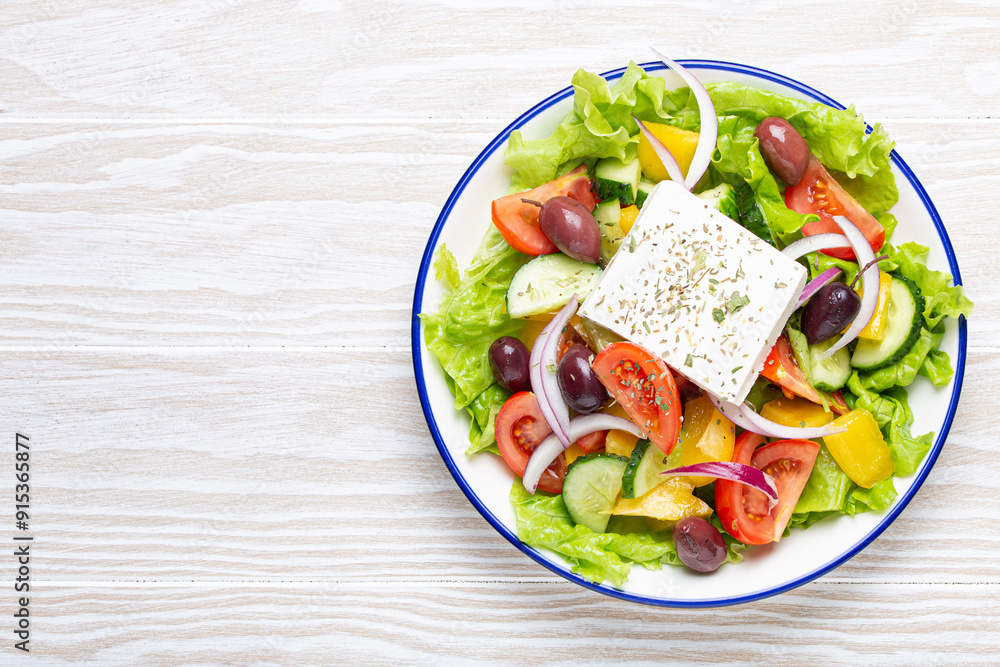 Traditional Greek Salad with Feta Cheese, Tomatoes, Bell Pepper, Cucumbers, Olives, Herbs in white ceramic bowl on White rustic wooden table background from above, Cuisine of Greece. Copy space