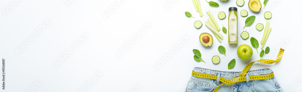 Green fruit, vegetables, smoothie falling into jeans and yellow measuring tape instead of belt on white background. Concept of weight loss, detox, diet, healthy clean nutrition, space for text