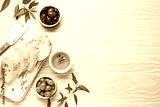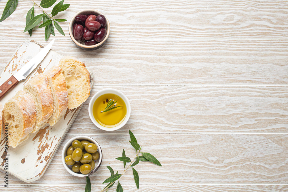 Sliced fresh ciabatta on cutting kitchen board, green and brown olives, olive oil with rosemary, olive tree branches, white wooden rustic background top view copy space