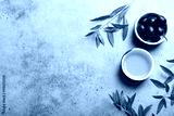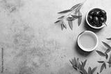 Black olives and extra virgin olive oil in little bowl with olive tree branches top view on gray concrete stone background, space for text