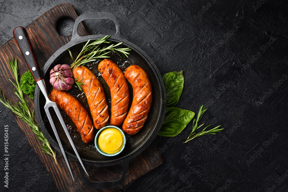 Cast iron pan with fried pork sausages. Top view. Barbecue or grill background.