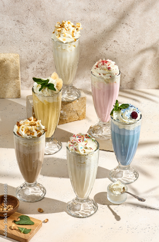 Assorted Milkshakes in Glasses - Delicious Beverages with Whipped Cream and Toppings