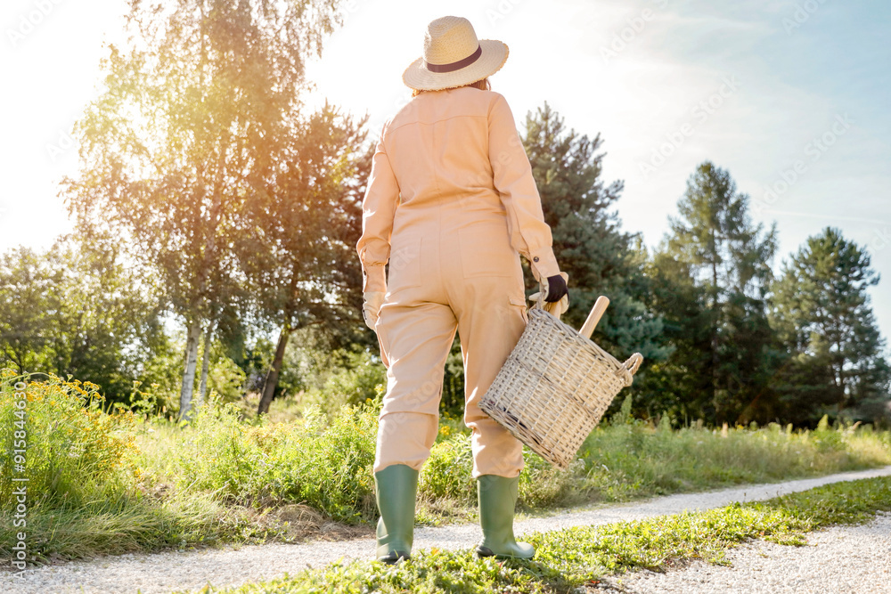 Woman gardener in straw hat and brown garden suit in the garden in warm autumn sunny day. Lush vegetation and grass and trees background. Autumn gardening.