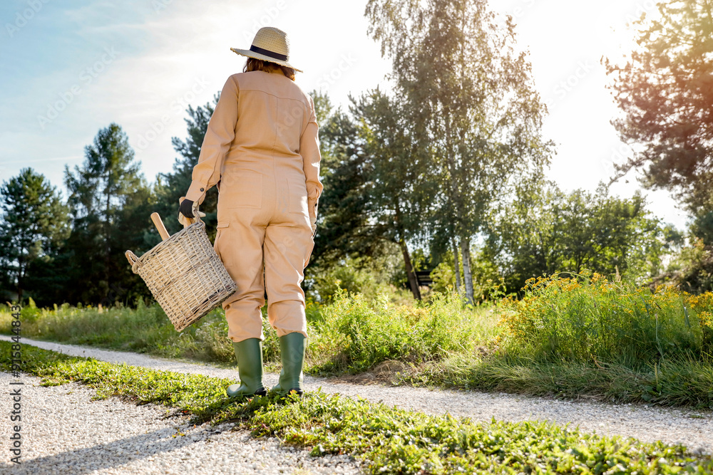 Farmer woman in gardening overalls and hat walking on road between fields and meadows. Lush greenery and trees and plants background. Sunny autumn gardening.