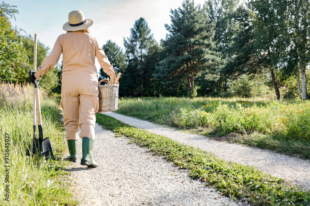 Farmer woman in gardening overalls and hat walking on road between fields and meadows. Lush greenery and trees and plants background. Sunny autumn gardening.