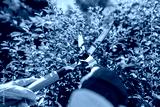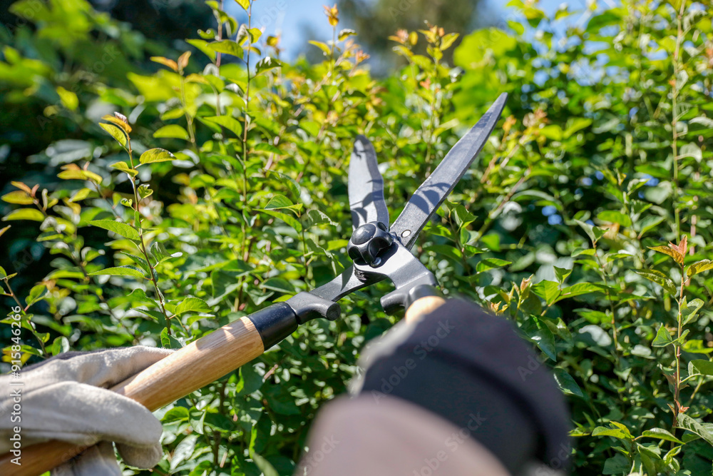 Gardener hands in garden gloves pruning trees with garden shears. Autumn warm and sunny day and tidying up in the garden.