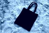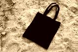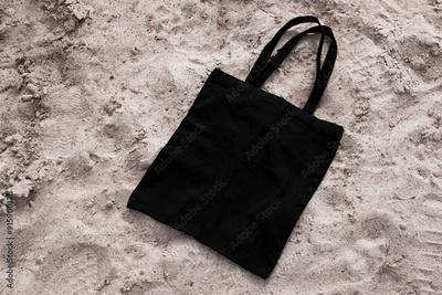Black cotton or mesh bag on beach sand background. Zero waste, no plastic, eco friendly shopping, recycling concept. Blank mockup shopper with place for artwork or text. Flat lay, copy space