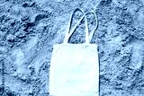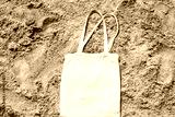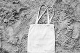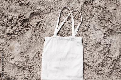 White cotton or mesh bag on beach sand background. Zero waste, no plastic, eco friendly shopping, recycling concept. Blank mockup shopper with place for artwork or text. Flat lay, copy space