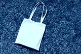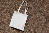 White cotton or mesh bag on beach sand background. Zero waste, no plastic, eco friendly shopping, recycling concept. Blank mockup shopper with place for artwork or text. Flat lay, copy space