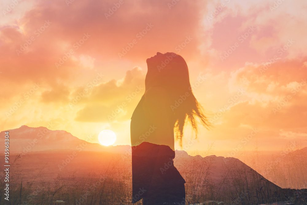 Young woman rejoices, laughs, smiles looking up to the sky, enjoys life and summer, nature, happiness.
