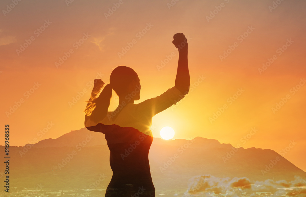 Strong confident woman, winning, success , and life goals concept. Young woman with arms flexed looking up to the sky.