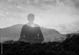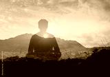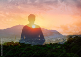 thoughtful man in sitting facing the sun, zen meditation at sunset.