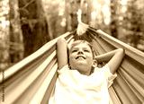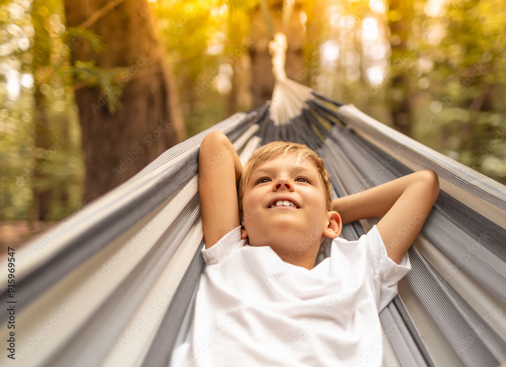 Happy carefree child lying in hammock feeling at peace in nature forest