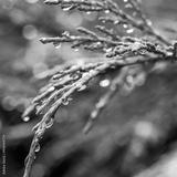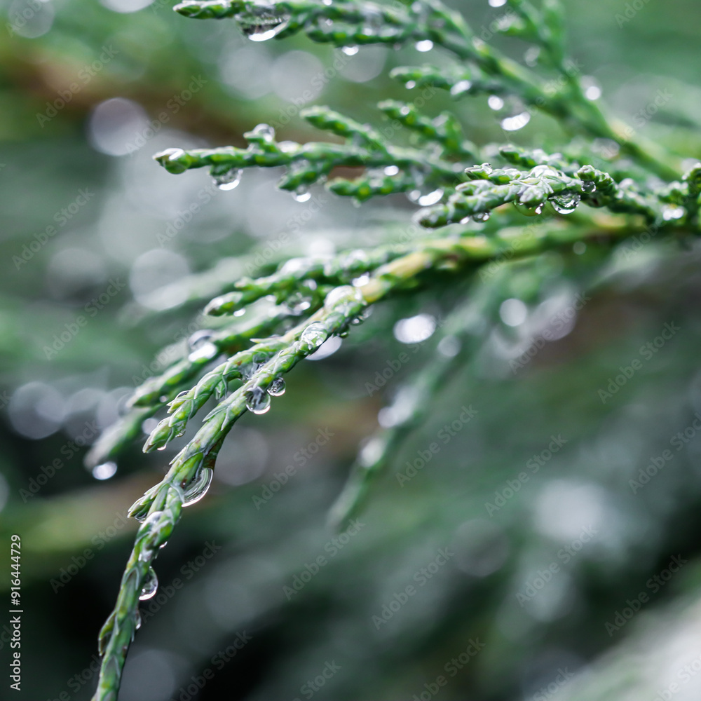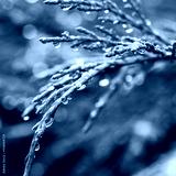 Texture, background of blue branches of coniferous evergreen juniper with rain drops. Bokeh with light reflection