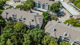 Apartment complex with covered parking garage surrounding by tall oak trees in North Arlington, Texas, rental gated community multistory condos townhome buildings with shingle roofing, aerial