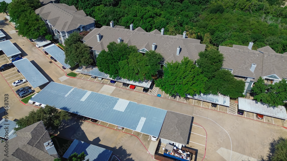 Covered parking garage in park side apartment complex with large dumpster trash in North Arlington, Texas, multistory condos townhomes rental community neighborhood lush green trees, aerial view