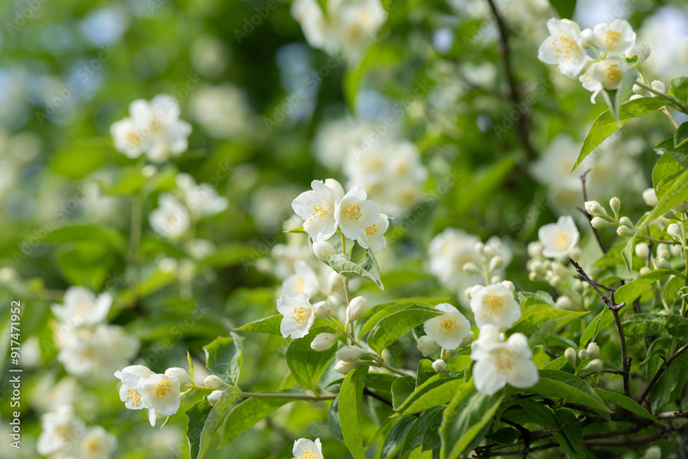 White jasmine flower on a green background. Ornamental garden shrub with amazing fragrance.