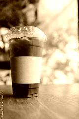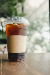 A glass of ice American coffee in a tall disposable glass with a brown paper sleeve cup