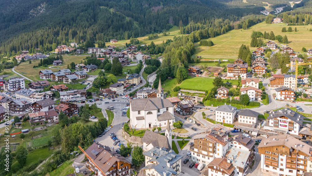 Aerial drone view of San Vito di Cadore, a charming town in Italy. View of Italian village in the dolomites during daytime in summer. 16 july 2024, San Vito di Cadore, Italy