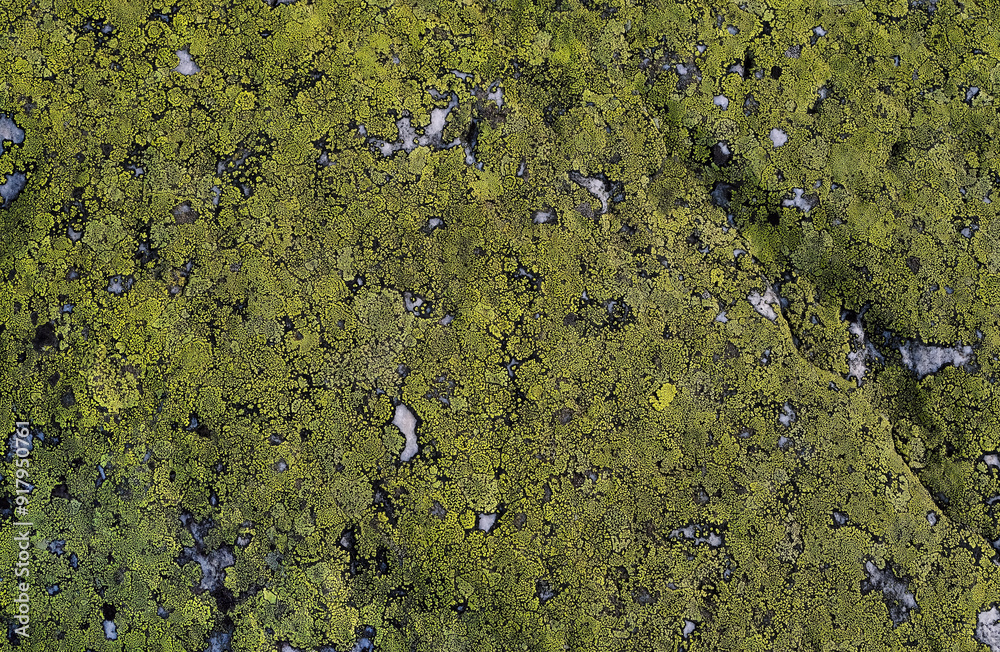 Textured surface of wild natural stone with green lichen. Rhizocarpaceae lichens in nature on grunge old rock. flat lay. close up. full frame. template for design