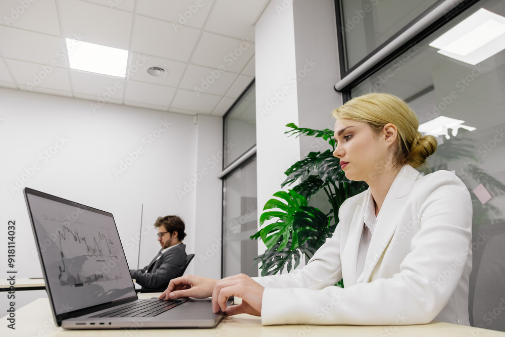 Stylish businesswoman, a director or marketing manager, works efficiently at her laptop in a modern coworking office. Ideal for themes of professionalism and workspace productivity.