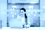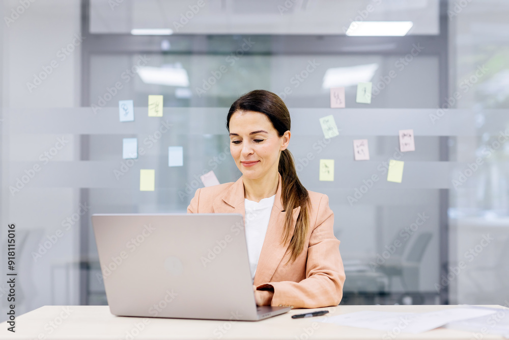 Stylish businesswoman, a director or marketing manager, works efficiently at her laptop in a modern coworking office. Ideal for themes of professionalism and workspace productivity.