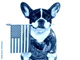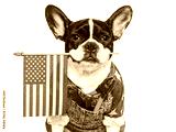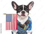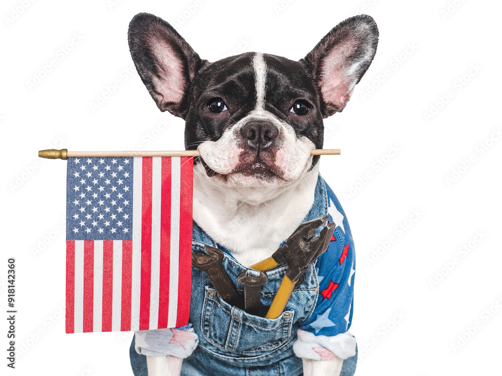 Charming puppy, American Flag and denim overalls. Close-up, indoors. Studio shot. Congratulations for family, relatives, loved ones, friends and colleagues. Pets care concept