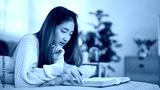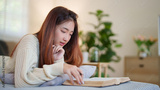 Young asian women in sweater lying on comfortable couch to enjoying with reading literature book and taking notes while relaxation and doing activity to spending time with slow life lifestyle at home.