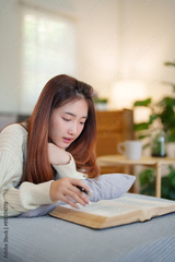 Young asian women in sweater lying on comfortable couch to enjoying with reading literature book and taking notes while relaxation and doing activity to spending time with slow life lifestyle at home.